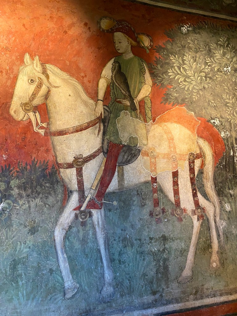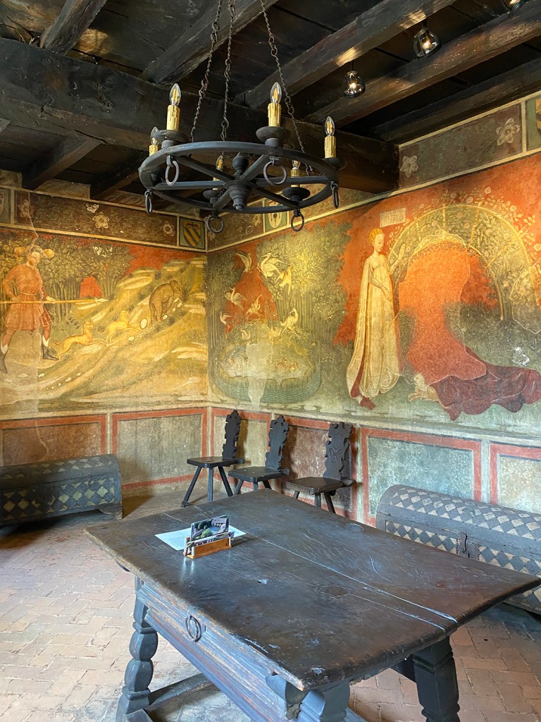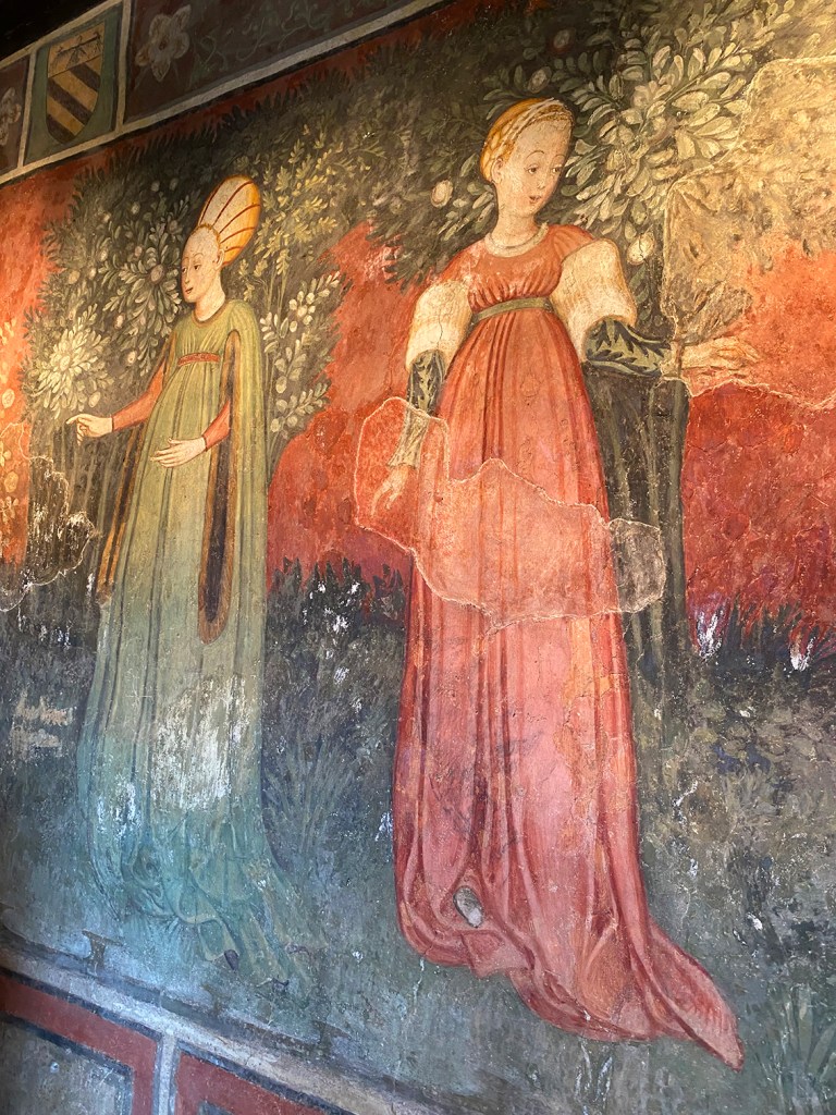 Durante i restauri del 1927 furono riportati alla luce raffinati affreschi quattrocenteschi, nascosti sotto la calce stesa durante la peste. Le scene raffigurano tematiche amorose, intervallate a episodi di caccia. Sono attribuite a un anonimo pittore lombardo influenzato dal Pisanello e dai fratelli Zavattari.
